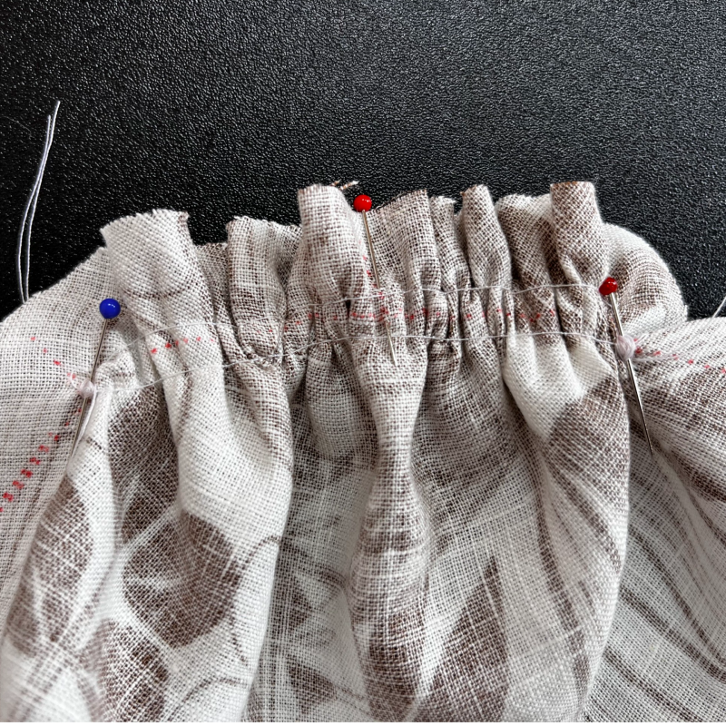 Steek een speld in de stof aan beide uiteindes van de rimpelsteken, zie foto. Je pakt nu de twee bovendraden van je rimpeldraden en trekt deze een stukje aan. Je ziet dat er nu vanzelf rimpels in de stof ontstaan. Zet de twee draden vast om de speld door 'achtjes' om de speld heen te draaien, zie onderstaande foto.